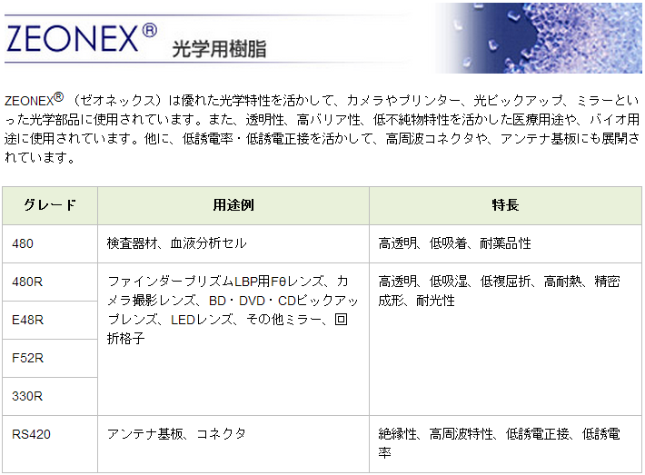 ZEONEX®はガラス転移溫度で120℃~160℃を有します。