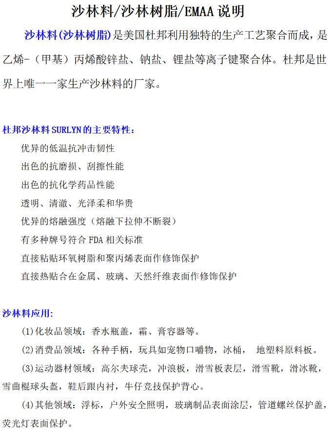 美國杜邦SURLYN(沙林料)EMAA工程塑料型號: