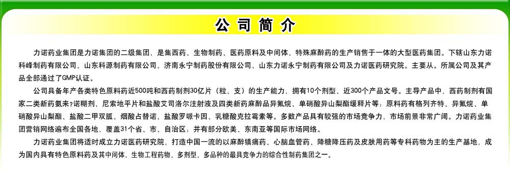 力諾藥業(yè)集團(tuán)是力諾集團(tuán)的二級(jí)集團(tuán),是集西藥、生物制藥、醫(yī)藥原料及中間體、特殊麻醉藥的生產(chǎn)銷售于一體的大型醫(yī)藥集團(tuán)。下轄山東力諾科峰制藥有限公司、山東科源制藥有限公司、濟(jì)南永寧制藥股份有限公司、山東力諾永寧制藥有限公司及力諾醫(yī)藥研究院。主要從。所屬公司及其產(chǎn)品**通過(guò)了GMP認(rèn)證。