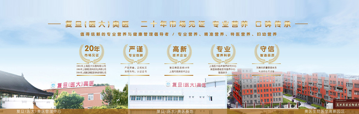 復(fù)旦(醫(yī)大)奧醫(yī)是以臨床營養(yǎng)、精準營養(yǎng)、特醫(yī)營養(yǎng)、婦幼營養(yǎng)、奧醫(yī)生物醫(yī)學(xué)高新園區(qū)為主導(dǎo)產(chǎn)業(yè)的上海市高新技術(shù)企業(yè)。2004年復(fù)旦大學(xué)頒布文件授權(quán)冠以“復(fù)旦”字號。