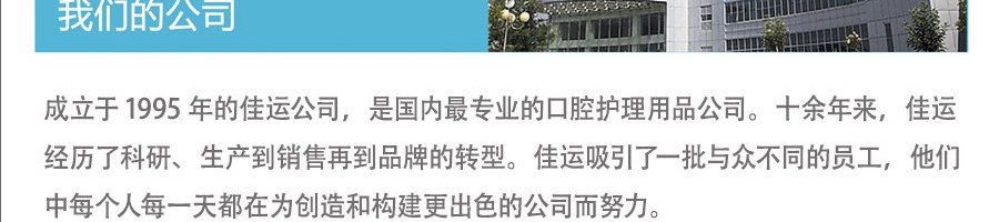 通過(guò)多年的奮斗拼搏,公司的事業(yè)蒸蒸日上。產(chǎn)品銷售突飛猛進(jìn),市場(chǎng)份額逐漸擴(kuò)大,目前已成為含漱類產(chǎn)品的龍頭。公司注重品質(zhì),講求信譽(yù),不求好,只求更好,主打產(chǎn)品佳運(yùn)牌口腔寶已深入消費(fèi)者的生活,深得廣大消費(fèi)者的信賴和醫(yī)學(xué)界朋友的厚愛(ài)…