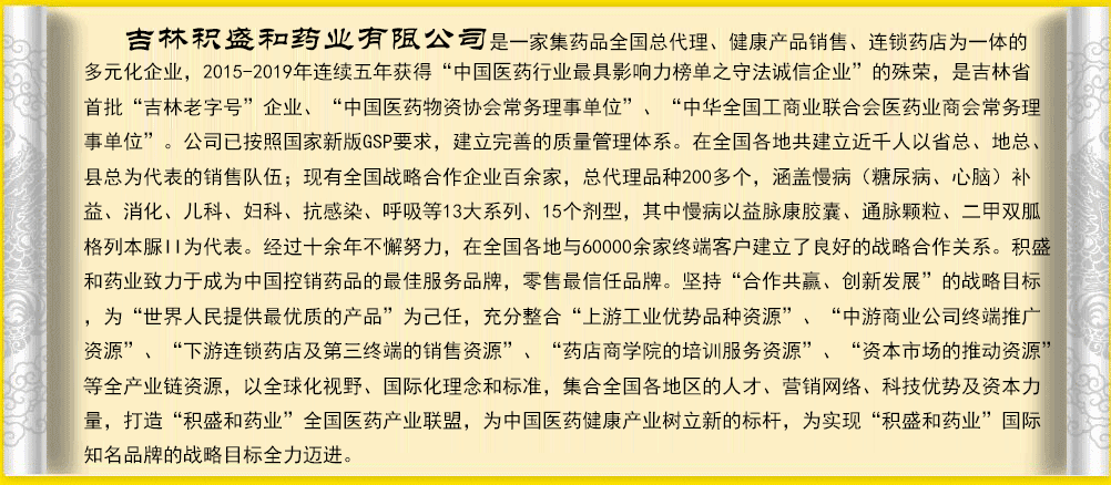 吉林積盛和藥業(yè)有限公司是一家集藥品全國總代理、健康產(chǎn)品銷售、連鎖藥店為一體的多元化企業(yè),2015-2019年連續(xù)五年獲得“中國醫(yī)藥行業(yè)*具影響力榜單之守法誠信企業(yè)”的殊榮,是吉林省首批“吉林***”企業(yè)、“中國醫(yī)藥物資協(xié)會(huì)常務(wù)理事單位”、“中華全國工商業(yè)聯(lián)合會(huì)醫(yī)藥業(yè)商會(huì)常務(wù)理事單位”。公司已按照國家新版GSP要求,建立完善的質(zhì)量管理體系。在全國各地共建立近千人以省總、地總、縣總為代表的銷售隊(duì)伍;現(xiàn)有全國戰(zhàn)略合作企業(yè)百余家,總代理品種200多個(gè),涵蓋慢。ㄌ悄虿、心腦)補(bǔ)益、消化、兒科、婦科、抗感染、呼吸等13大系列、15個(gè)劑型,其中慢病以益脈康膠囊、通脈顆粒、二甲雙胍格列本脲II為代表。經(jīng)過十余年不懈努力,在全…