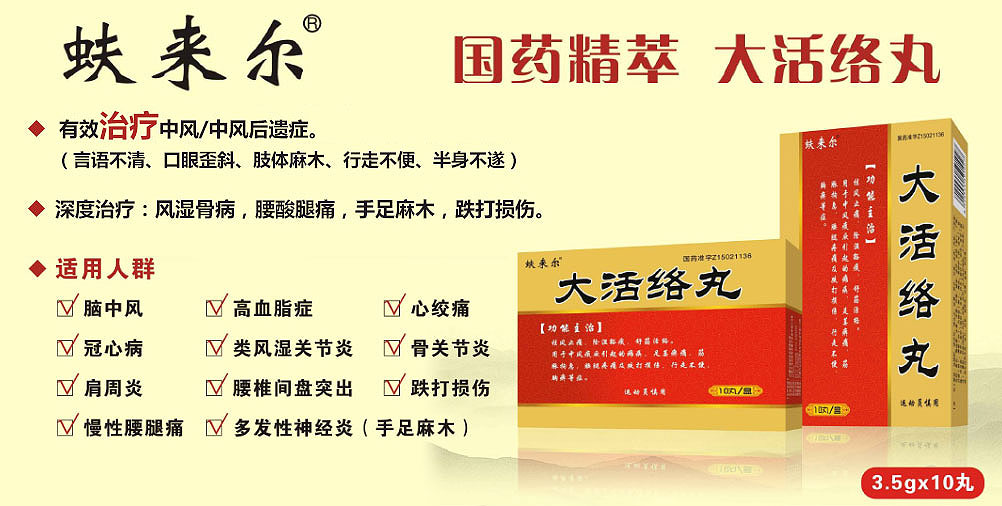 中風(fēng)怎么辦?用大活絡(luò)丸! ——Rae 中風(fēng)一直以來(lái)都是老年人十分懼怕的疾病,一旦沾染上,不僅自身的健康受到了極大的損害,對(duì)日常的生活也帶來(lái)了不小的麻煩。俗話說(shuō)的好,“久病床前無(wú)孝子”,很多時(shí)候現(xiàn)實(shí)就是如此殘酷,再孝順的兒女,可以親自照顧臥床不便的父母1年、2年,但是5年、10年