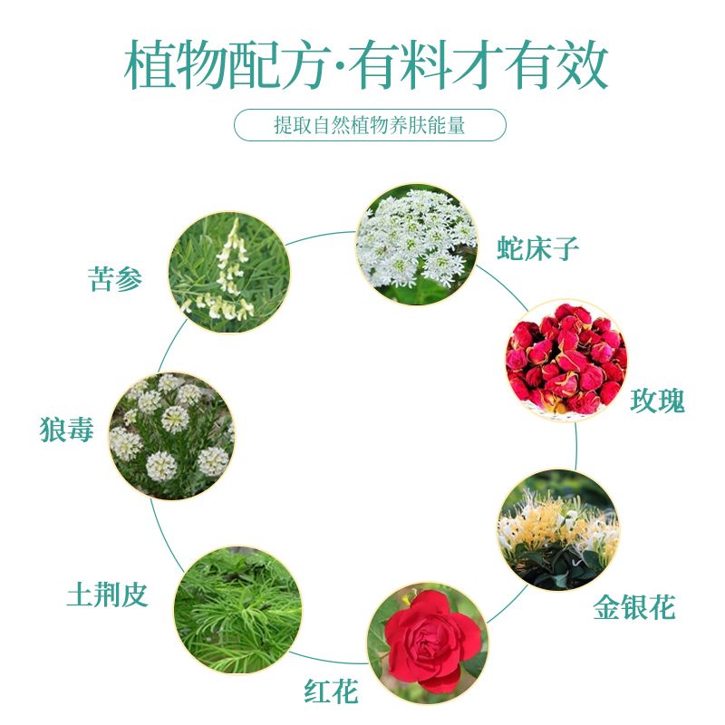 | 主要成分 | 玫瑰、蛇床子、艾葉、紅花、蘆薈、薄荷腦、黃柏、冰片、苦參、土荊皮、金銀花、醋酸洗必泰等。 |