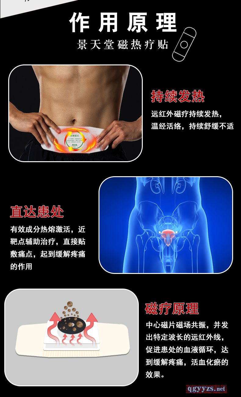| 作用機(jī)理 | 作用原理: 【持續(xù)發(fā)熱】遠(yuǎn)紅外磁療持續(xù)發(fā)熱,溫經(jīng)活絡(luò),持續(xù)舒緩不適 【直達(dá)患處】有效成分熱熔激活,近靶點(diǎn)輔助治療,直接貼敷痛點(diǎn),起到緩解疼痛的作用 【磁療原理】中心磁片磁場(chǎng)共振,并發(fā)出特定波長的遠(yuǎn)紅外線,促進(jìn)患處的血液循環(huán),達(dá)到緩解疼痛,活血化瘀的效果。 |