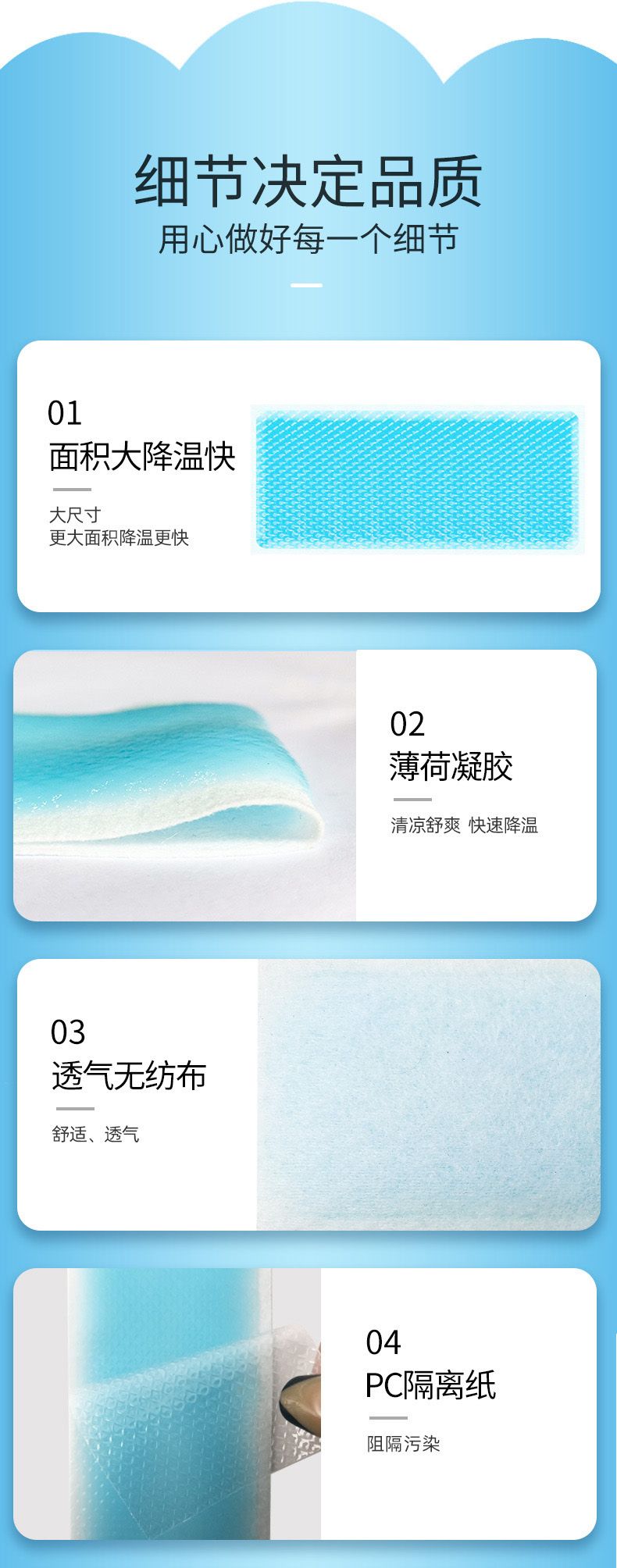 | 主要成分 | 由水、甘油、聚丙烯酸鈉、甘氨酸鋁、乙二胺四乙酸二鈉、酒石酸,DMDM乙內(nèi)酰脲、亮藍和各種形式的無紡布背襯層、凝膠層、聚乙烯薄膜覆蓋層組成。降溫物質(zhì)不含有發(fā)揮藥理學(xué)、免疫學(xué)或者代謝作用的成分,不包含附錄所列成分。非無菌產(chǎn)品。 |