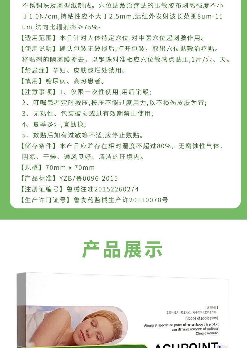 | 產(chǎn)品用途 | 本品針對(duì)人體特定穴位,對(duì)中醫(yī)穴位起刺激作用。 |
