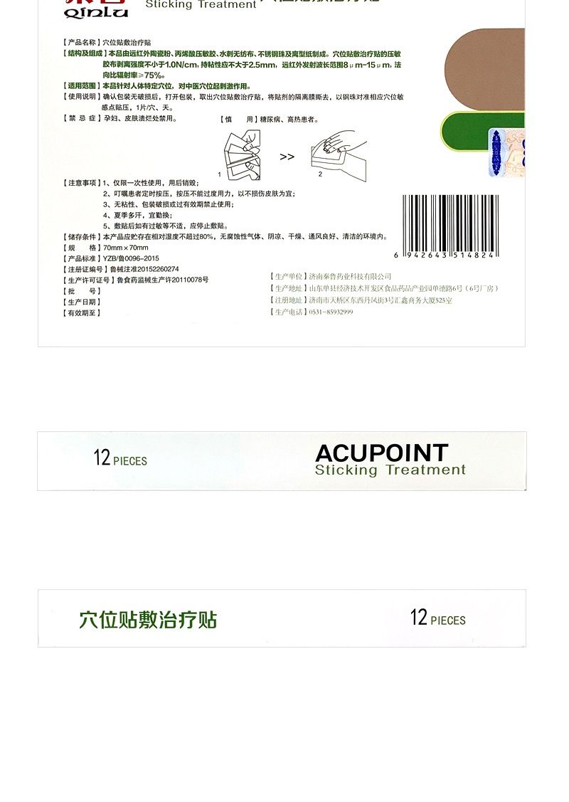 | 使用方法 | 1、清潔相應(yīng)穴位,先以拇指依次揉按相應(yīng)穴位,每穴1~2分鐘,范圍由小到大,力量由輕到重,探尋敏感點(diǎn)。2、確認(rèn)包裝無(wú)破損后,打開包裝,取出穴位貼敷治療貼,將貼劑的隔離膜撕去,以鋼珠對(duì)準(zhǔn)相應(yīng)穴位敏感點(diǎn)貼壓,1片/穴、天,每日適度按壓3~5次,每次3~5分鐘,1個(gè)療程為10天,療程間隔2~3天。 |