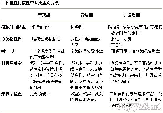 三、診斷要點(diǎn):慢性化膿性中耳炎包括鼓膜的穿孔,中耳腔的活動(dòng)性感染,病程持續(xù)數(shù)周或更長(zhǎng)。感染時(shí)膿液可很多,流出耳道,或很少僅可通過(guò)耳內(nèi)鏡或顯微鏡才可發(fā)現(xiàn)。這類(lèi)疾病常見(jiàn)于咽鼓管功能不佳的患者,聽(tīng)力下降是常見(jiàn)的癥狀。按照傳統(tǒng)的中耳炎的分型,由于各類(lèi)慢性化膿性中耳炎在預(yù)后及處理原則上不同,因此還必須在結(jié)合體格檢查、影像學(xué)檢查等,對(duì)病變的類(lèi)型作出明確診斷。三種慢性化膿性中耳炎鑒別要點(diǎn):