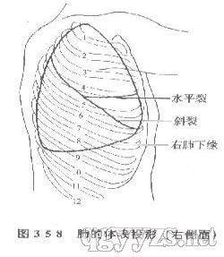1、肺 尖:位于鎖骨之上,其最高點偏內,近鎖骨的胸骨端,達第1 胸椎的水平,骨上約3cm 。