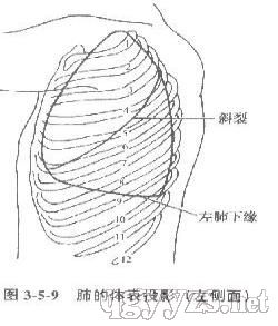3、肺外側界:由肺上界向下延伸而成,幾乎與側胸壁的內表面相接觸。
