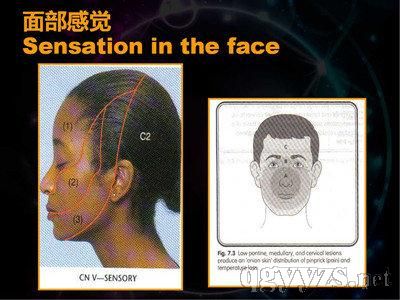1、面部感覺:用圓頭針、棉簽末端搓成的細毛及盛冷熱水試管(或音叉表面)分別測試面部三叉神經(jīng)分布區(qū)皮膚的痛、溫和觸覺,用音叉測試振動覺,兩側及內外對比。