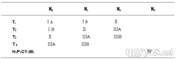 表中Ⅳ期胃癌包括如下幾種情況:N3淋巴結(jié)有轉(zhuǎn)移、肝臟有轉(zhuǎn)移H1、腹膜有轉(zhuǎn)移P1、腹腔脫落細胞檢查陽性CY1和其他遠隔轉(zhuǎn)移M 1,包括胃周以外的淋巴結(jié)、肺臟、胸膜、骨髓、骨、腦、腦脊膜、皮膚等。