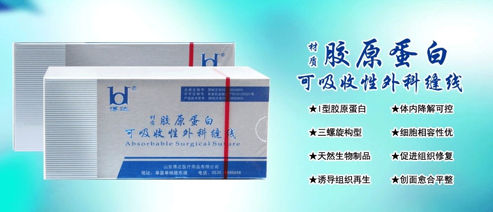 山東博達(dá)醫(yī)療用品股份有限公司是生產(chǎn)可吸收性外科縫線專業(yè)廠家,主要產(chǎn)品有可吸收縫合線 、內(nèi)窺鏡圈套線、穴位埋線、快吸收美容線、醫(yī)用羊腸線 膠原蛋白線以獨(dú)特的生物技術(shù)提取了健康哺乳動(dòng)物內(nèi)臟的膠原蛋白為基材,采用先進(jìn)獨(dú)特的工藝加工而成,線體的主要成分為高純度膠原蛋白,并獲得了國(guó)家發(fā)明專利,頒布了YZB/國(guó)6301-2013《可吸收性外科縫線》產(chǎn)品標(biāo)準(zhǔn),并通過了ISO9001:2008和ISO13485:2003質(zhì)量管理體系認(rèn)證。
