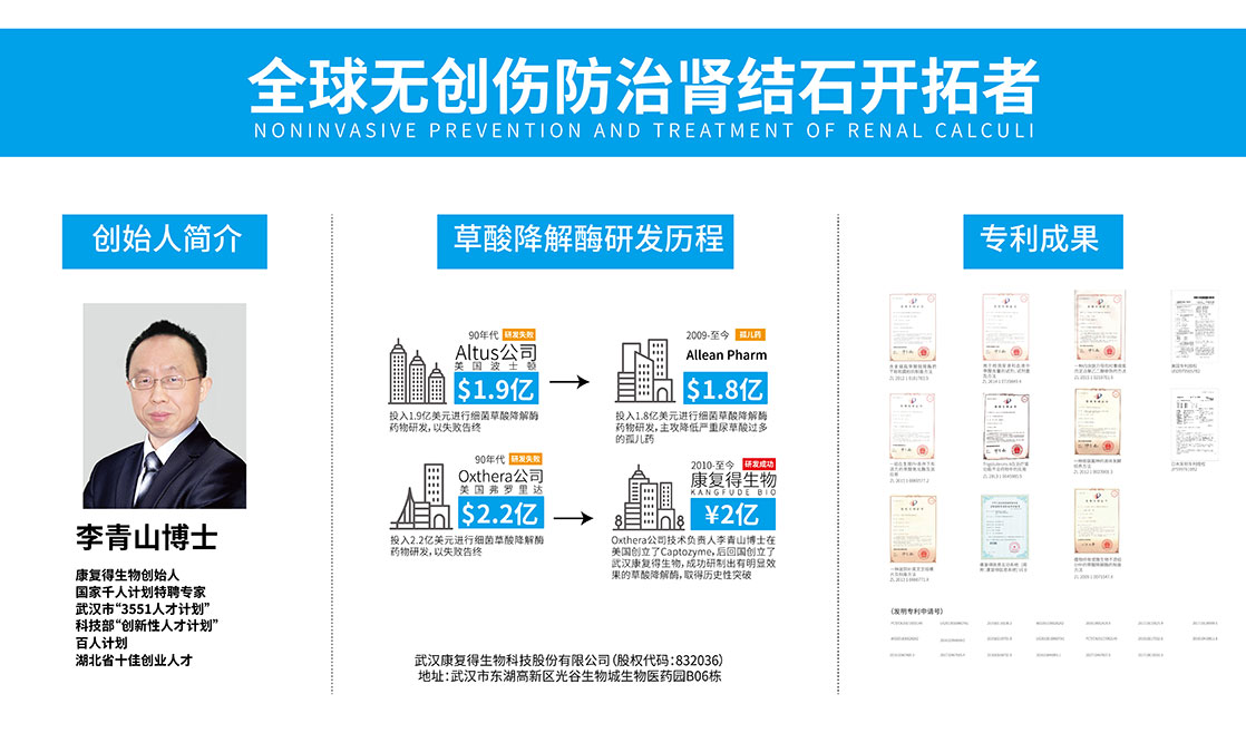 康復(fù)得生物致力于利用中美兩國資源,持續(xù)不斷地進(jìn)行創(chuàng)新,為腎結(jié)石患者提供優(yōu)質(zhì)的腎健康管理服務(wù),成為腎結(jié)石防治領(lǐng)域知名企業(yè)。
