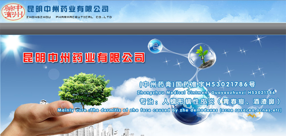 昆明中州藥業(yè)有限公司(原云南中州制藥有限公司)位于中國(guó)昆明市經(jīng)濟(jì)技術(shù)開(kāi)發(fā)區(qū)經(jīng)東路16號(hào),是擁有自主知識(shí)產(chǎn)權(quán)的GMP制藥企業(yè),生產(chǎn)中華人民共和國(guó)發(fā)明專利藥品:《中州藥膏》通用名稱:氧化鋅升華硫軟膏。發(fā)明專利號(hào):ZL-200510048633.0。是PRC創(chuàng)新科技研制具有殺螨、殺菌、消炎、潤(rùn)膚治療人類蠕形螨性皮炎(青春痘、酒渣鼻)國(guó)藥準(zhǔn)字H53021786文號(hào),OTC甲類的正規(guī)治療藥品。現(xiàn)已出口歐、美、亞、港、澳、臺(tái)等國(guó)家和地區(qū)。本公司由PRC研制藥物發(fā)明專利權(quán)人趙中州教授擔(dān)任董事長(zhǎng)、總經(jīng)理兼制藥總工程師。公司宗旨是堅(jiān)持醫(yī)學(xué)臨床科研與制藥為一體,以質(zhì)量,信譽(yù)至上,發(fā)揚(yáng)光大中州精神,為患者服務(wù),把中國(guó)發(fā)明專利藥品《中州藥膏》奉獻(xiàn)給國(guó)內(nèi)外的朋友們。為保護(hù)人類面部皮膚的健美做出貢獻(xiàn)。