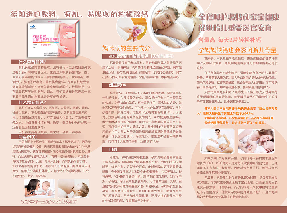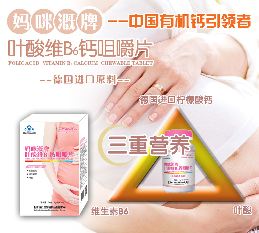 | 【產(chǎn)品賣點】 | 1、可靠:國家食品藥品監(jiān)督管理總局批準營養(yǎng)補充劑;德國進口有機鈣原料(檸檬酸鈣),有機鈣易吸收對腸胃無刺激,不會造成結(jié)石和便秘; 2、方便:檸檬酸鈣、葉酸、維生素B6三味主要成分黃金組合,檸檬酸鈣屬于有機鈣;葉酸利于心腦血管預(yù)防中風;維生素B6參與人體蛋白及糖的代謝,對貧血及美發(fā)有一定的作用。 |