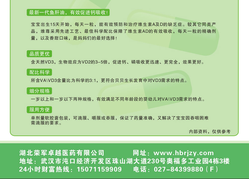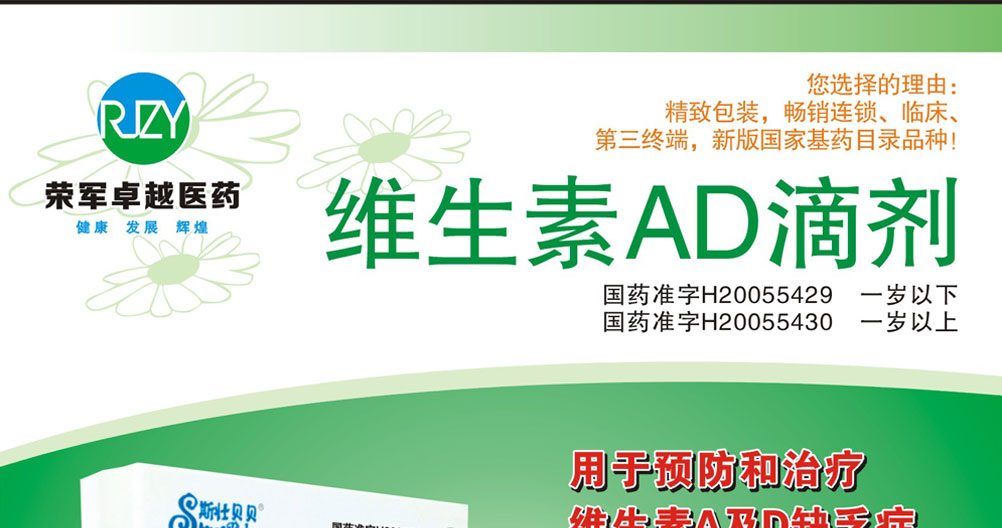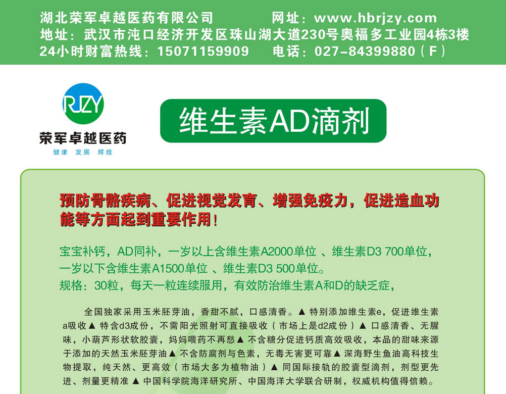 | 【功能主治】 | 作用/功效:維生素AD滴劑用于預防和治療維生素A及D的缺乏癥。如佝僂病、夜盲癥及小兒手足抽搐癥等癥狀。 效果:維生素AD滴劑由維生素A及維生素D組成。維生素A和D是人體生長發(fā)育必需的物質(zhì),能夠?qū)μ、嬰幼兒的發(fā)育,上皮組織的完整性、視力、生殖器官、血鈣和磷的恒定、骨骼、牙的生長發(fā)育等起到良好的效果。 價格:目前市面上由煙臺元生藥業(yè)有限公司生產(chǎn)的0-1歲幼兒食用的維生素AD滴劑(膠囊型)的市場零售價格為25元每盒,詳細的代理/招商價格可通過下方聯(lián)系方式與廠家聯(lián)系,也可直接留言給我們。 |