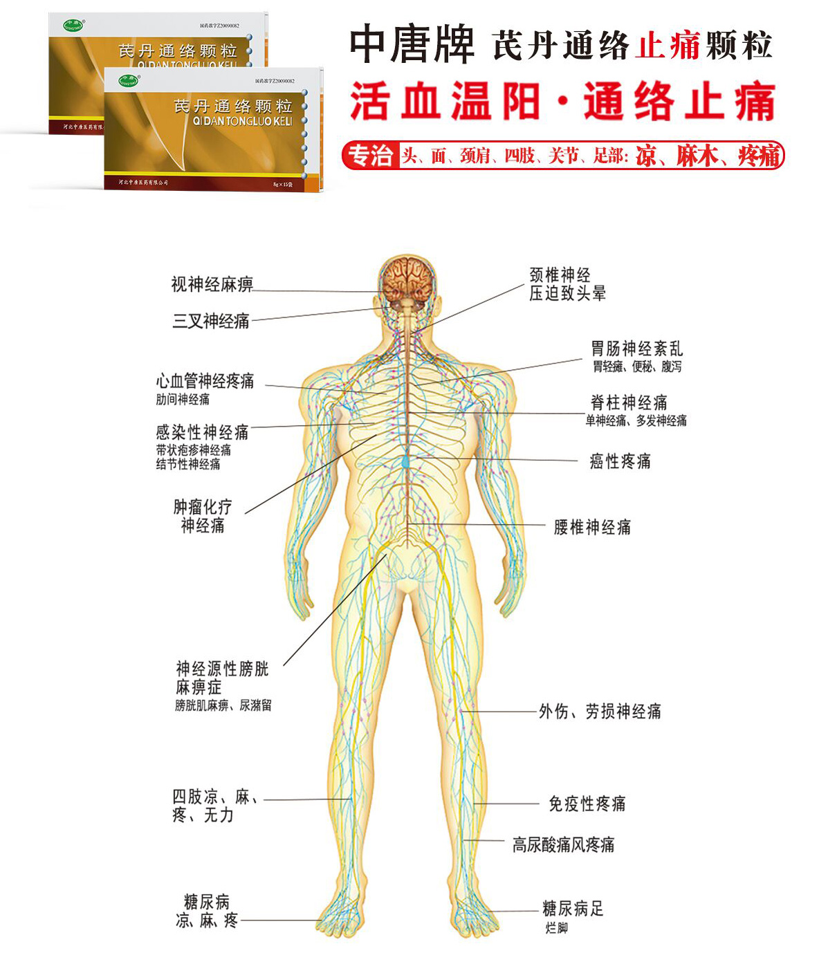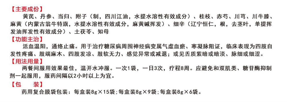 功能主治 | 活血溫陽,通絡(luò)止痛。用于治療糖尿病周圍神經(jīng)病變屬氣虛血瘀、寒凝脈阻證,臨床表現(xiàn)為四肢自發(fā)性疼痛、肢端麻木、四肢發(fā)涼、肢軟無力、感覺異;驕p退;或見舌質(zhì)紫暗或暗淡、脈細或細澀。 |