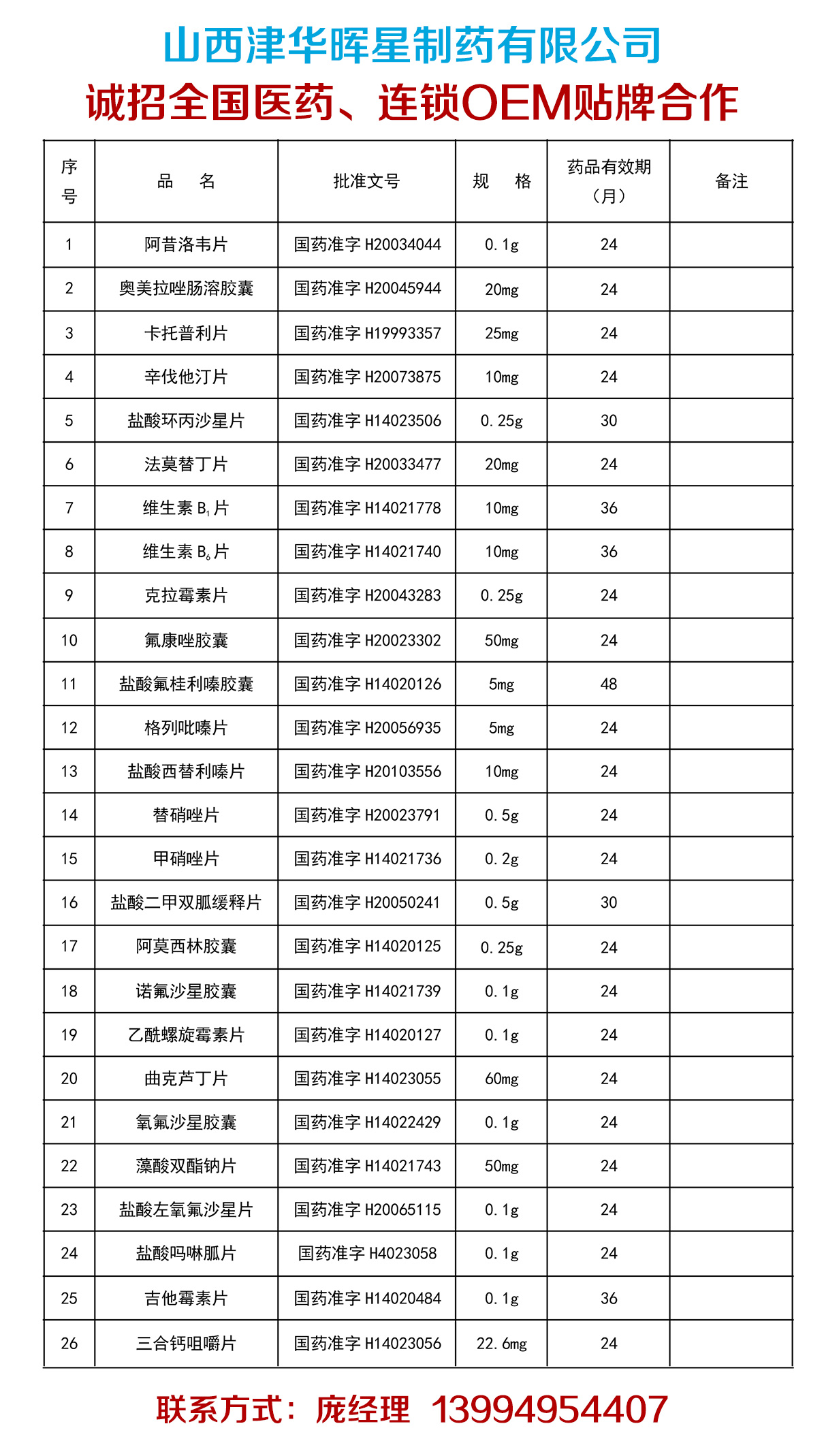 山西津華暉星制藥有限公司產(chǎn)品展示列表, 技術支持:環(huán)球醫(yī)藥招商網(wǎng) (招商頻道-醫(yī)藥代理-otc-處方藥)     版權所有,違版必究