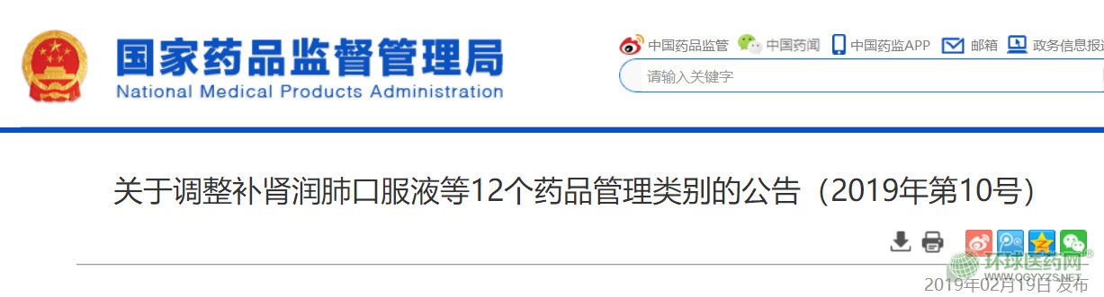 2月19日,國家藥監(jiān)局發(fā)布《關(guān)于調(diào)整補腎潤肺口服液等12個藥品管理類別的公告(2019年第10號)》。