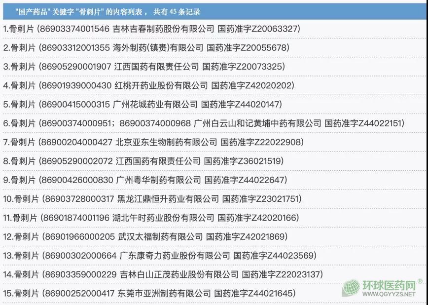 據(jù)賽柏藍(lán)在藥監(jiān)局官網(wǎng)查詢,骨刺片共有國(guó)產(chǎn)藥品批文45條。其中包括和記黃埔、紅桃開(kāi)藥業(yè)、南京同仁堂藥業(yè)、亞寶藥業(yè)、葵花藥業(yè)等知名藥企都有批文。