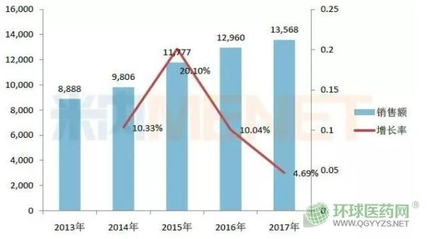 據(jù)米內(nèi)網(wǎng)數(shù)據(jù)顯示,2015年起,聚乙二醇4000散在中國公立醫(yī)療機構終端銷售額已經(jīng)突破億元,2017年上漲至1.36億元,增長率為4.69%。該產(chǎn)品2017年在瀉藥內(nèi)服產(chǎn)品TOP20中排名第六。
