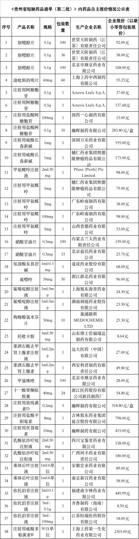 據(jù)《通知》,《貴州省短缺藥品清單(第二批)》內(nèi)藥品掛網(wǎng)采購價格自主申報工作已完成,現(xiàn)公示企業(yè)自主報價情況,公示時間為3個工作日,10月17日17:00截止。