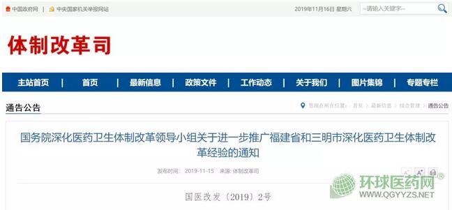 11月15日,國家衛(wèi)健委發(fā)布了《關(guān)于進一步推廣福建省和三明市深化醫(yī)藥衛(wèi)生體制改革經(jīng)驗的通知》(以下簡稱“通知”)。