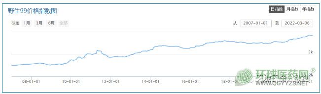 從野生99價(jià)格指數(shù)看:野生品種行情出現(xiàn)過(guò)4次峰值,整體行情走勢(shì)持續(xù)上行,年均復(fù)合漲幅達(dá)到9.07%。