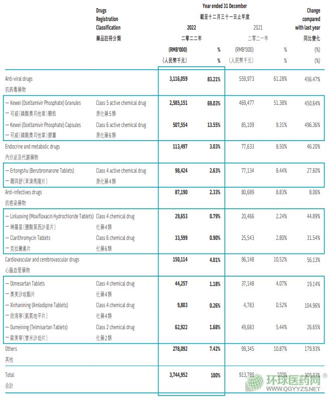 “絕對核心產(chǎn)品”奧司他韋貢獻(xiàn)了82%以上的營收。2022年,宜昌東陽光藥的奧司他韋銷售額實現(xiàn)近三年來的首次反彈。根據(jù)財報數(shù)據(jù),2022年奧司他韋的銷售額為30.93億元,較去年同比增加457.66%。