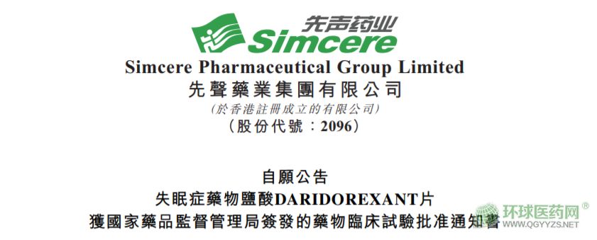 2023年7月20日,先聲藥業(yè)宣布,與瑞士Idorsia公司合作的新型抗失眠藥物鹽酸Daridorexant片,已獲得國家藥品監(jiān)督管理局簽發(fā)的藥物臨床試驗批準(zhǔn)通知書,擬用于治療癥狀持續(xù)存在至少3個月且對日間功能產(chǎn)生影響的成人失眠患者。
