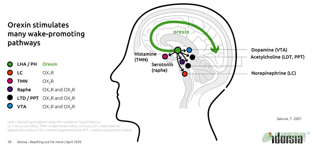 Daridorexant是一種雙重食欲素受體拮抗劑(DORA),可阻斷促進覺醒的食欲素神經(jīng)肽(食欲素A和食欲素B)與其受體結(jié)合,與與傳統(tǒng)失眠藥物(如苯二氮䓬類藥物)通過鎮(zhèn)靜大腦來促進睡眠不同,Daridorexant僅阻斷食欲素神經(jīng)肽對食欲素受體的激活。因此,Daridorexant減少喚醒驅(qū)動,誘導(dǎo)睡眠發(fā)生,而不改變睡眠結(jié)構(gòu),且沒有次日殘留效應(yīng)。