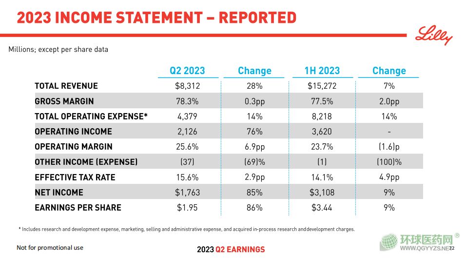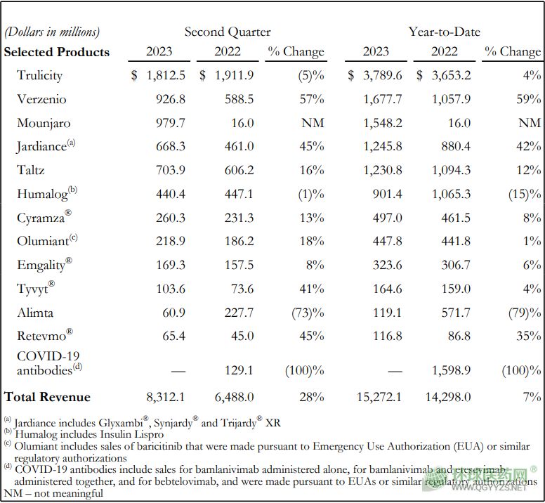 8月8日,著名跨國藥企禮來公布2023年第二季度及上半年業(yè)績,上半年總收入152.72億美元,同比增長7%。其中第二季度收入為83.12億美元,同比增長28%,凈收入為17.63億美元,同比增長85%。由于上半年總收入超過預(yù)期,禮來更新了2023年業(yè)績指引,將全年預(yù)期上調(diào)了22億美元,預(yù)計全年營收將達到334~339億美元。