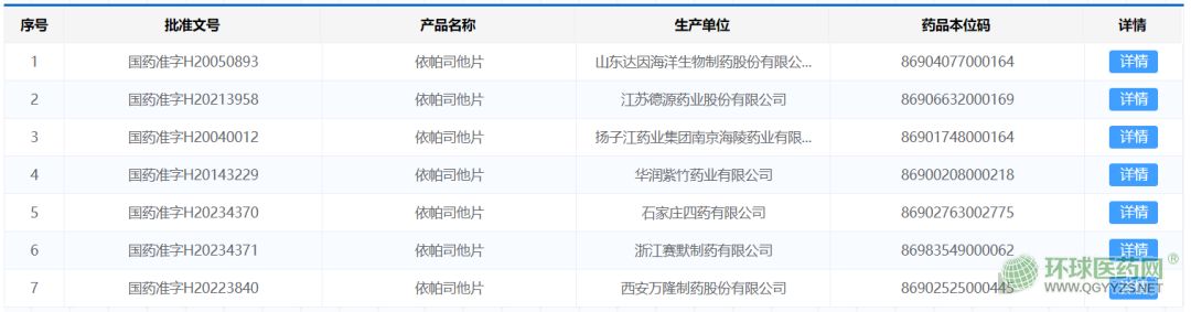 根據(jù)國家藥品監(jiān)督管理局官網(wǎng)檢索顯示,目前國內(nèi)有揚(yáng)子江藥業(yè)集團(tuán)南京海陵藥業(yè)、浙江賽默制藥、石家莊四藥等7家藥企擁有依帕司他片生產(chǎn)批文。還有成都倍特藥業(yè)、樂普制藥、中山萬漢制藥、河北瑞森藥業(yè)、北京雙鷺?biāo)帢I(yè)等8家企業(yè)的依帕司他片在審評審批中。