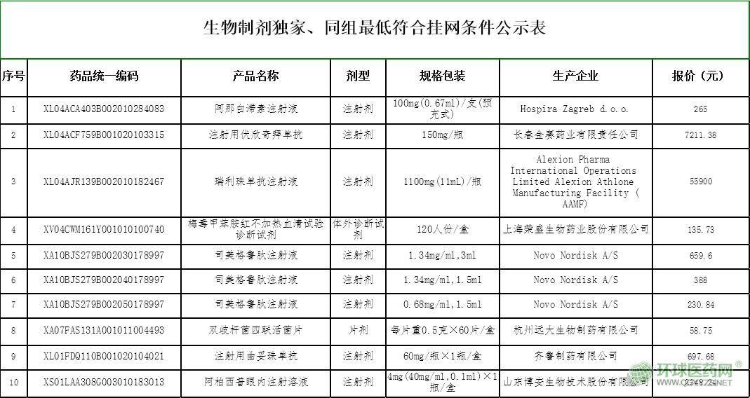 1.生物制劑獨家、同組最低符合掛網(wǎng)條件公示表