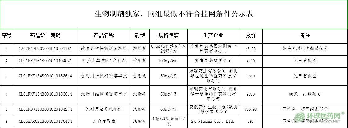 2.生物制劑獨家、同組最低不符合掛網(wǎng)條件公示表