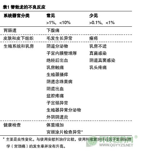 該部分內(nèi)容囊括了 21 項安慰劑空白對照研究(包括 LIFT 研究)中所記錄的不良反應(yīng),在這些研究中有 4079 名女性受試者接受了治療劑量的替勃龍(1.25 mg 或 2.5 mg)治療,3476 名女性受試者接受了安慰劑的治療。這些研究的治療期在 2 個月~4.5 年不等。表 1 列出替勃龍治療組與安慰劑對照組之間具有統(tǒng)計學(xué)差異的不良反應(yīng)。