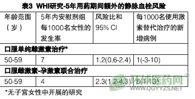 激素替代治療與靜脈血栓栓塞(VIE,即深靜脈血栓或肺栓塞)相對風(fēng)險發(fā)生增加 1.3-3 倍有關(guān)。該類事件的發(fā)生更可能見于使用激素替代治療的第一年(見【注意事項】)。女性健康倡議(WHI)研究結(jié)果如下所示: