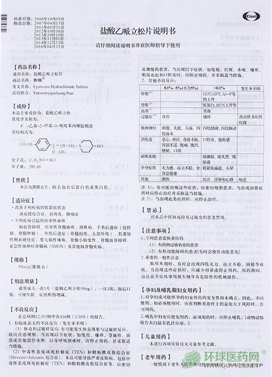【藥品名稱】通用名稱:鹽酸乙哌立松片