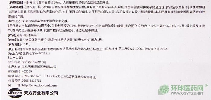 【藥理作用】抗心絞痛藥。本品屬硝酸酯類化合物,具有阻止細(xì)胞內(nèi)鈣離子游離,增加細(xì)胞膜對(duì)鉀離子的通透性,擴(kuò)張冠狀血管,持續(xù)性增加冠狀動(dòng)脈血流量,抑制冠狀動(dòng)脈痙攣的作用,在擴(kuò)張冠狀血管時(shí),并不影響血壓、心率、心肌收縮力以及心肌耗氧量。本品還具有抑制血小板聚集防止血栓形成的作用。