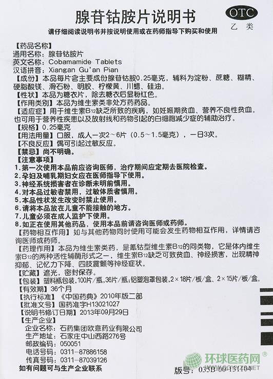 石藥集團歐意腺苷鈷胺片說明書文字版