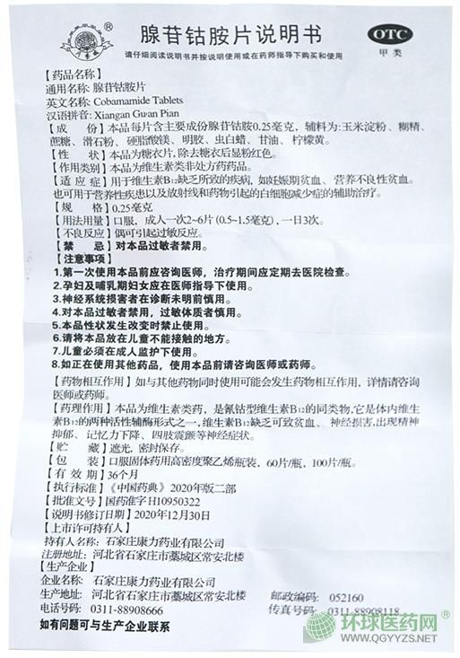 石家莊康力腺苷鈷胺片說明書圖片版(2020年版)