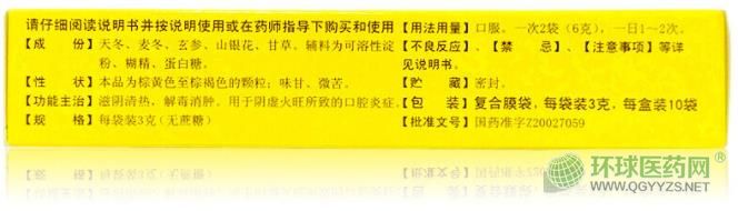 [功能主治] 滋陰清熱,解毒消腫。用于陰虛火旺所致的口腔炎癥。