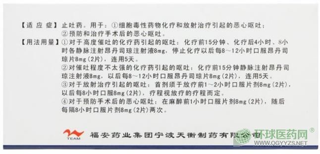 ③對(duì)于放射治療引起的嘔吐:首劑須于放療前1~2小時(shí)口服片劑8mg(2片),以后每8小時(shí)口服8mg(2片),療程視放療的療程而定。