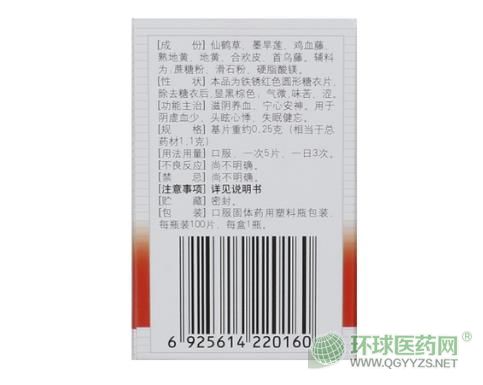 【主要原料】仙鶴草、墨旱蓮、雞血藤、熟地黃、地黃、合歡皮、首烏藤。輔料為硬脂酸鎂、滑石粉、蔗糖、胭脂紅。