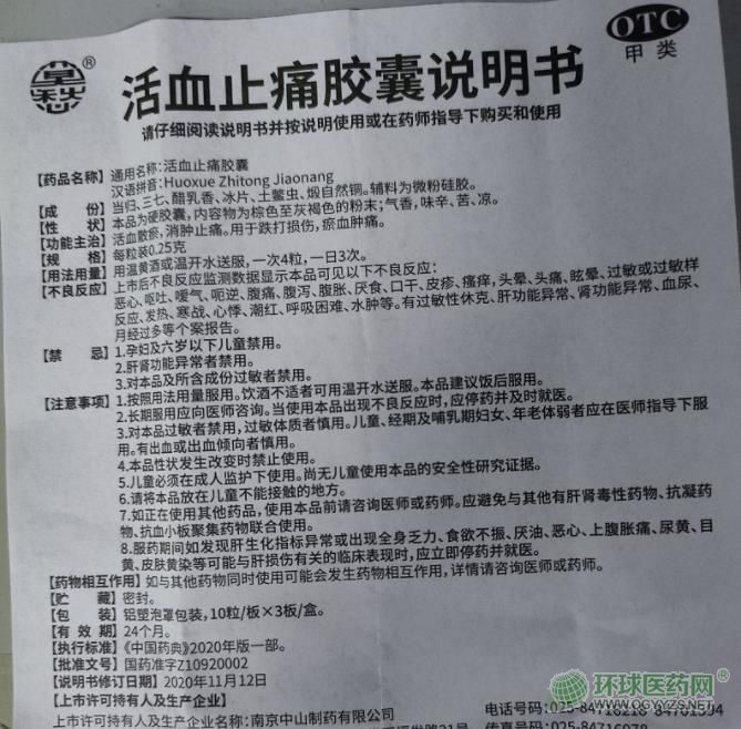 南京中山制藥活血止痛膠囊的說明書圖片版