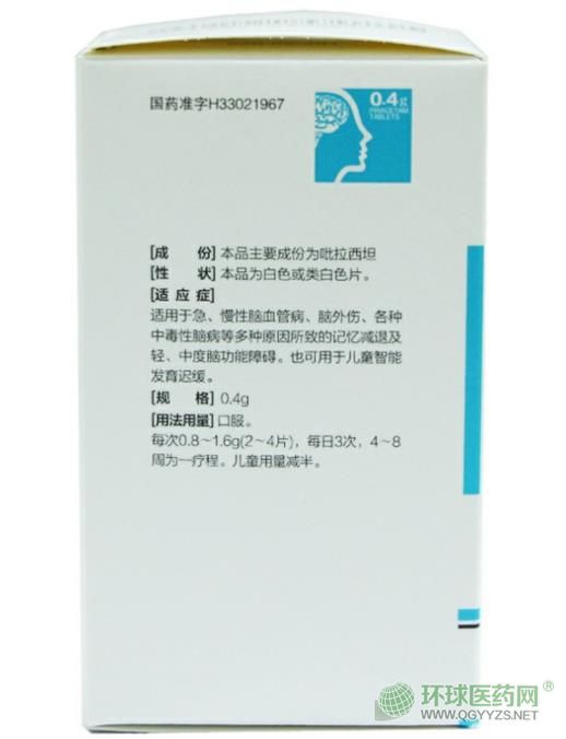 【藥代動力學(xué)】口服本品后很快從消化道吸收,進入血液,并透過血腦屏障到達腦和腦脊液,大腦皮層和嗅球的濃度較腦干中濃度更高。易通過胎盤屏障?诜,30~45分鐘血藥濃度達到峰值,血漿蛋白結(jié)合率30,半衰期T1/2為5-6小時。體積分布容積為0.6L/kg。吡拉西坦口服后不能由肝臟分解,以原形形式從尿和糞便中排泄。腎清除速度為86ml/分鐘。大便排出量約為1%~2%。