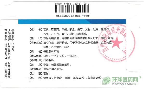 【成份】苦參、石菖蒲、柴胡、郁金、白芍、龍骨、牡蠣、酸棗仁、五味子、枳殼、厚樸。輔料:玉米淀粉。