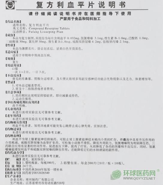 常州制藥廠復(fù)方利血平片說明書文字版